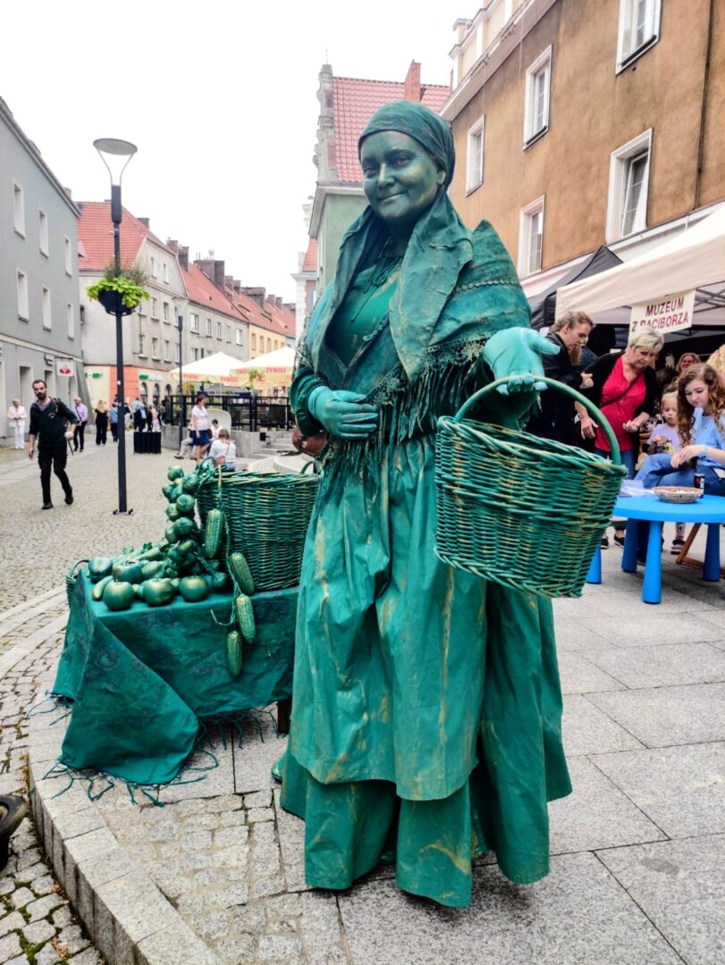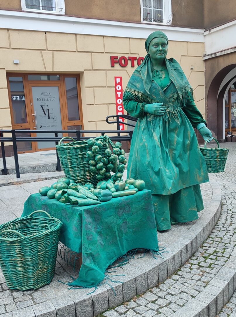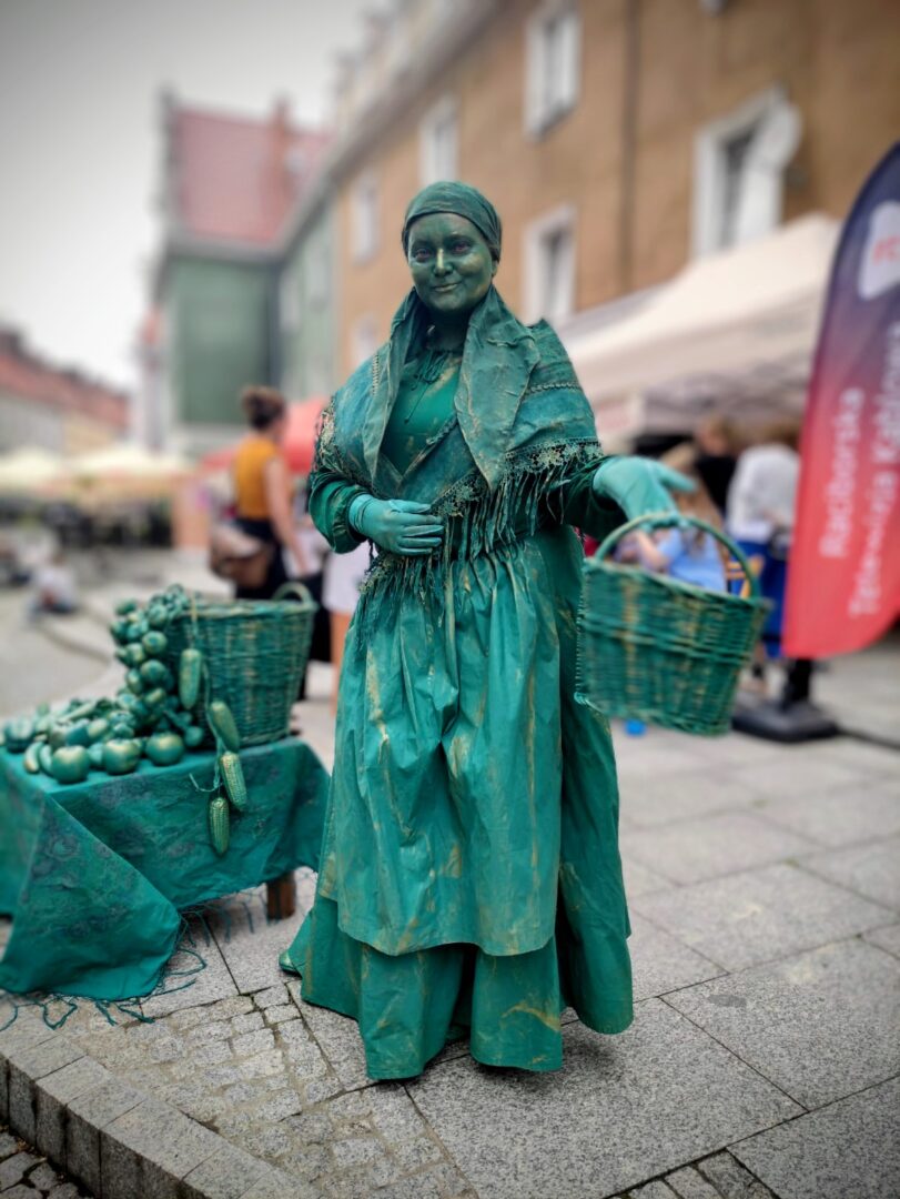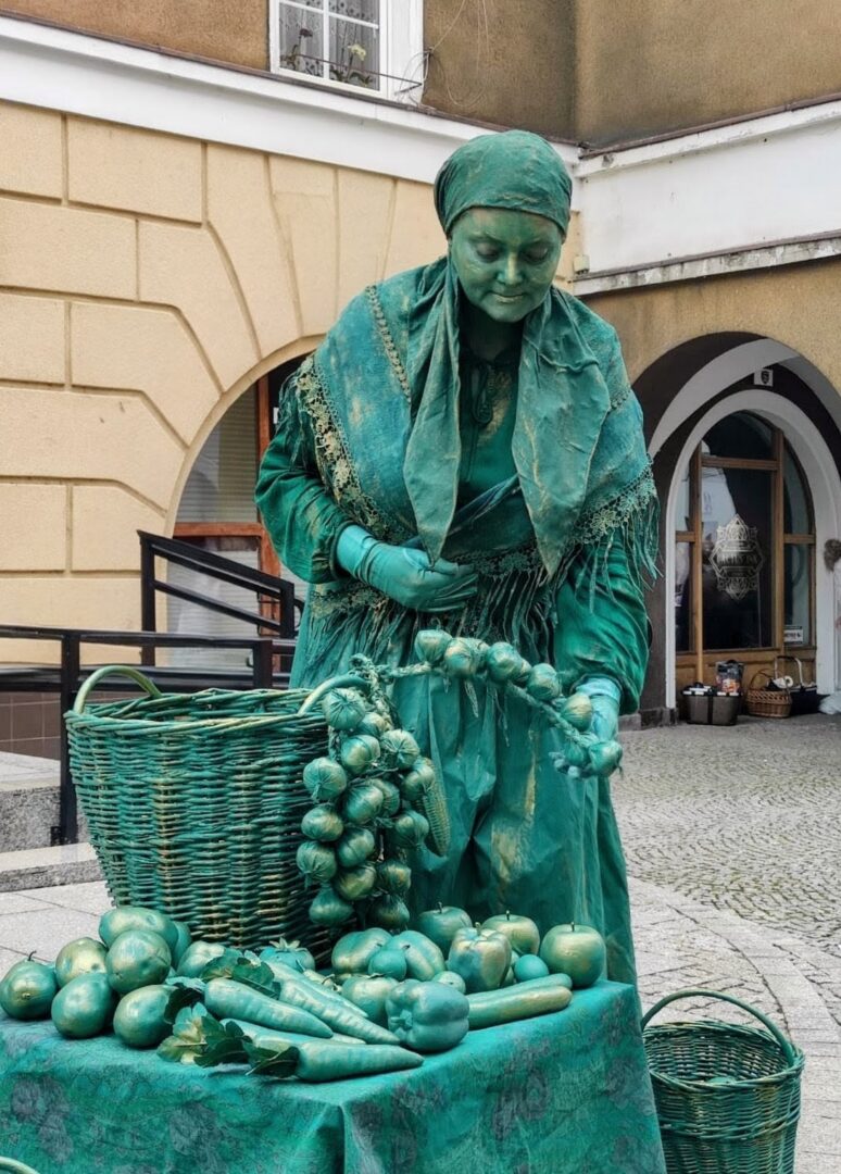 A classic living statue, rendered in mesmerizing colors of bottle green and delicate gold. Tradeswoman will take you to a world where the main squares of cities and towns were bustling with life and a diverse range of trade.