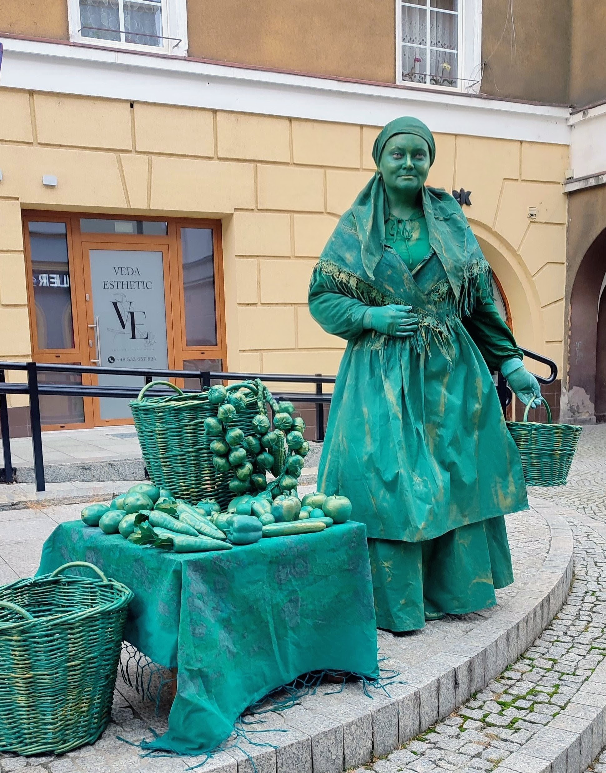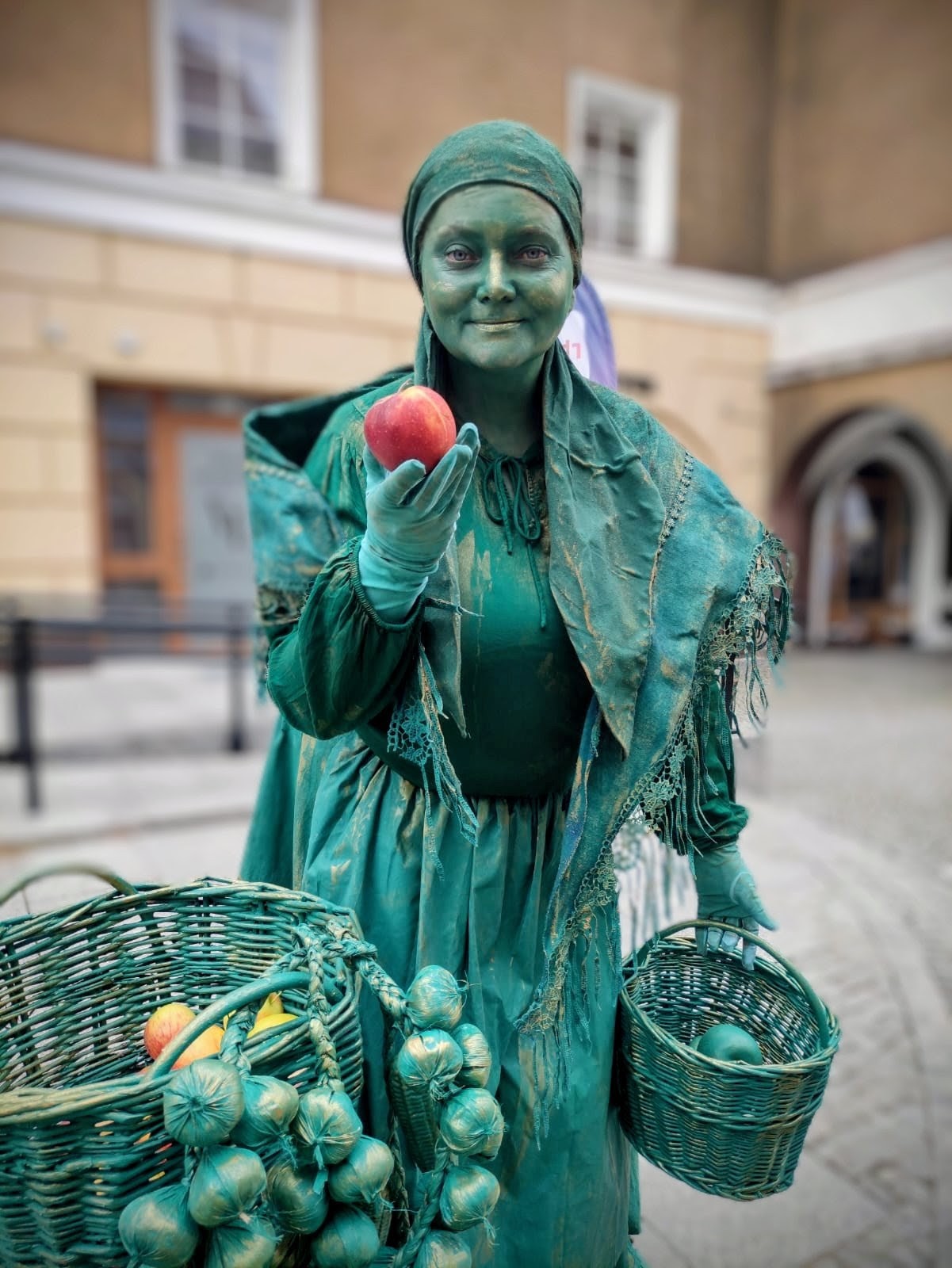 A classic living statue, rendered in mesmerizing colors of bottle green and delicate gold. Tradeswoman will take you to a world where the main squares of cities and towns were bustling with life and a diverse range of trade.